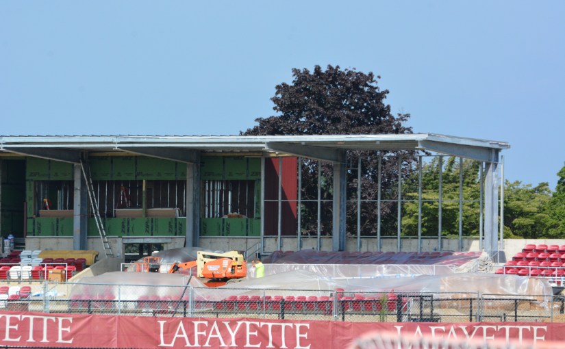 I made a short trip to Easton and saw a Lafayette Campus in the process of rebuilding on many fronts. The path leading down the hill from the campus is being rebuilt, there is a new dorm rising on a building site off of McCartney street, and out at Metzger there is construction on a new stadium for soccer rising. The soccer stadium should be ready for the first home game, but there is still lots of work to be done. The soccer stadium is the first of the physical enhancements scheduled for Lafayette’s athletic facilities.